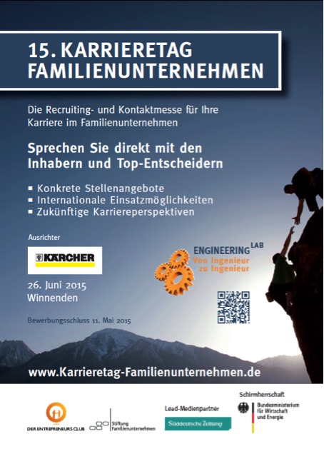 „Treffen Sie die Inhaber und Top-Entscheider Deutschlands führender Familienunternehmen am 26. Juni 2015 bei der Alfred Kärcher GmbH & Co. KG in Winnenden. Sprechen Sie über konkrete Stellenangebote, internationale Einsatzmöglichkeiten und zukünftige Karriereperspektiven.“