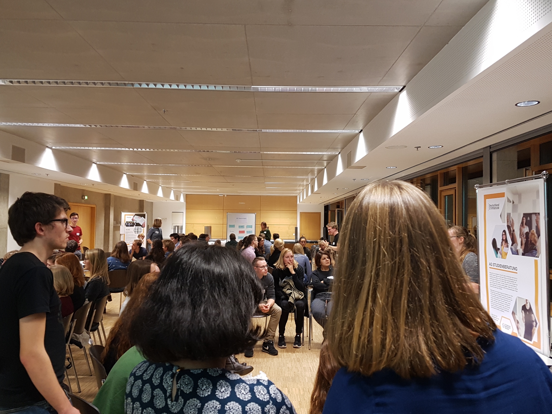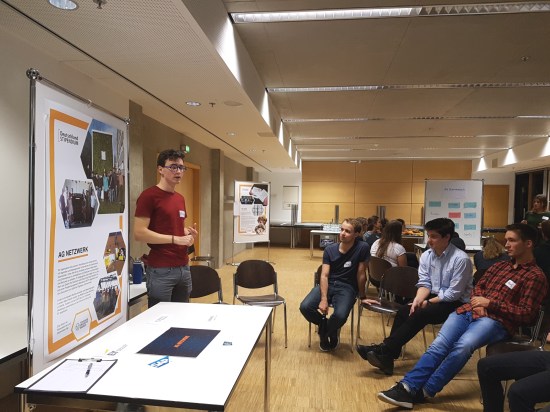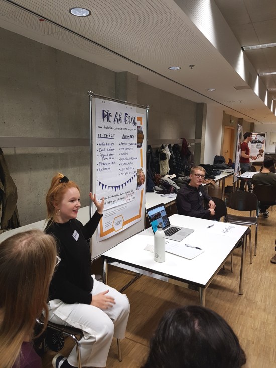 Diese fanden anhand eines Galerierundgangs statt: Alle fünf AGs hatten einen kleinen Stand mit Poster und wurden durch 1-2 Vertreter*innen zunächst jeweils einer der Kleingruppen vorgestellt. Durch die kleine Runde konnten ungezwungen Tätigkeitsbereiche erklärt und Fragen gestellt werden. Nach einigen Minuten rotierten alle Gruppen eine AG weiter und die AGs kamen mit einer neuen Gruppe ins Gespräch… Das Ganze geschah fünf mal, sodass am Schluss alle anwesenden Stips alle AGs kennen gelernt hatten. Ein dickes Dankeschön nochmals an alle AG-Vertreter, die fünf mal nacheinander ihre AG vorgestellt haben und an alle interessierten Zuhörer!