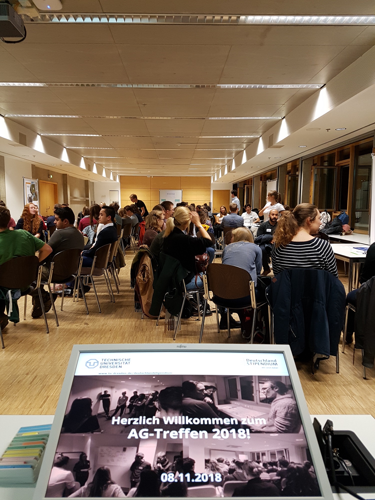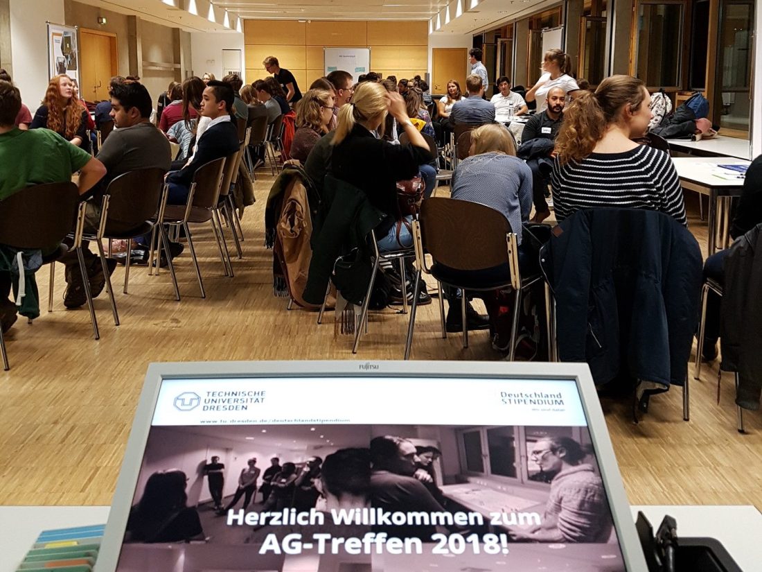 An einem November-Abend trafen sich rund 70 Studierende in einem schick hergerichteten Raum des zentral gelegenen Hörsaalzentrums. Den Auftakt bereitete das stets engagierte Team des Deutschlandstipendiums, die sich auch für diesen Abend wieder einige tolle Sachen ausgedacht haben. An dieser Stelle sei nochmal erwähnt, dass sich jeder mit Fragen und Problemen an das Team wenden kann (deutschlandstipendium@tu-dresden.de). In einer kurzen Einleitung wurde der allgemeine Rahmen des Deutschlandstipendiums abgesteckt und wichtige Punkte erläutert.