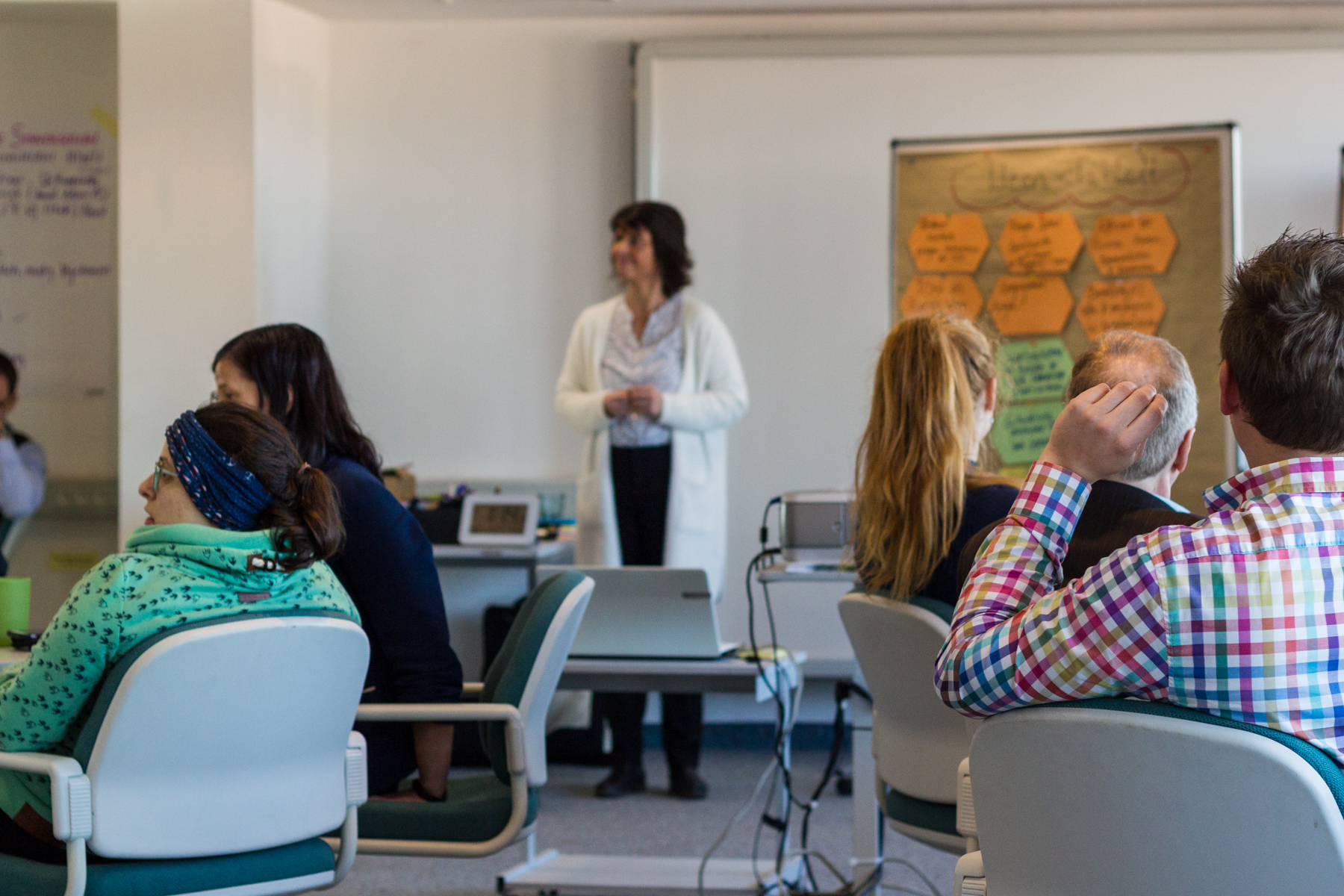 Das Förderernetzwerk des Deutschlandstipendiums TUD traf sich am 28.11.2018 zum gemeinsamen Design Thinking-Workshop. Kommunikationstrainerin Susan Kindler führte durch den Vormittag mit verschiedensten Methoden, um den TeilnehmerInnen erlebnisorientierten Austausch nahezubringen. Das Ergebnis: farbenfrohe Flipcharts, originelle Skizzen sowie über 50 Möglichkeiten, eine Orange zu schälen.