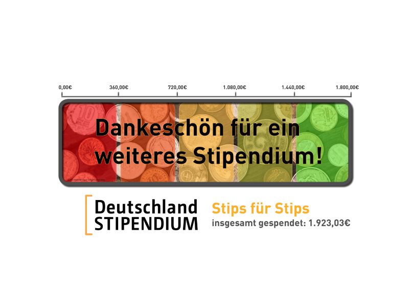 Hallo ihr lieben Stipendiat*innen, UNGLAUBLICH, ABER WAHR! Das Ziel, gemeinsam ein Deutschlandstipendium mehr für den Förderzeitraum 2019/20 zu stemmen, ist schon beinahe erreicht! Von 1.800,00 € habt ihr bereits großartige 1.447,00 € gespendet! Ein ganz herzliches, großes, lautes Dankeschön an alle unter euch, die bereits auf einen Betrag ihrer Wahl in ihrem eigenen Alltag verzichtet…